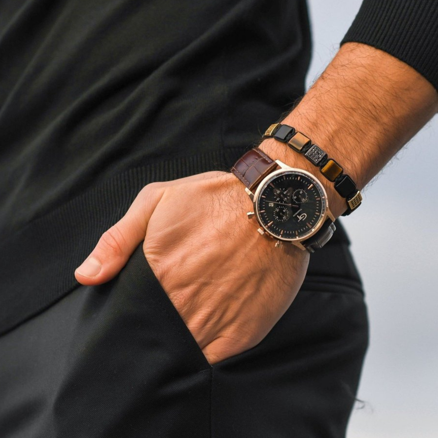 Reloj para hombre - Correa de cuero marrón - Esfera de reloj negra