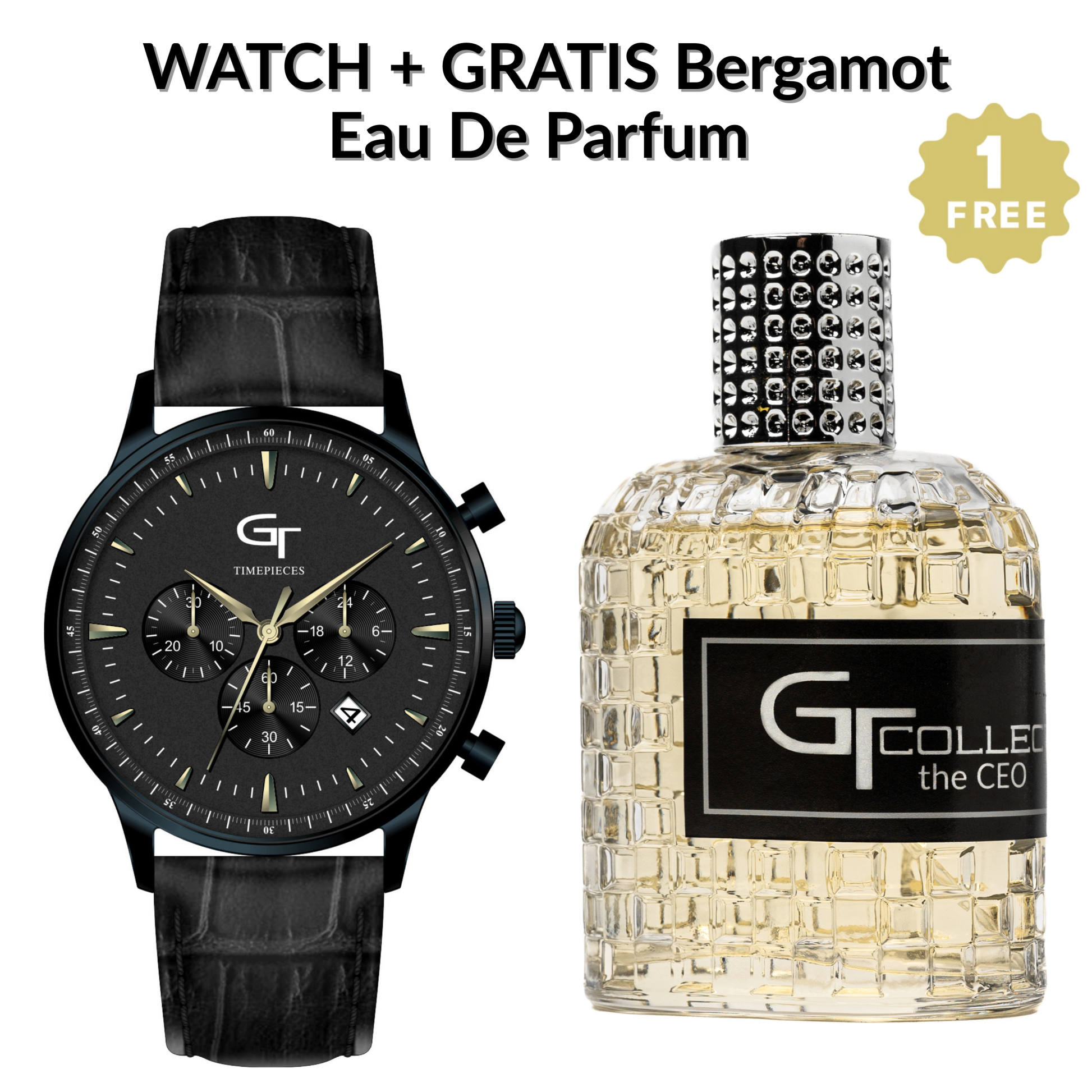 Elegant Men's Watch Black + Free Bergamot Perfume - Gift Set