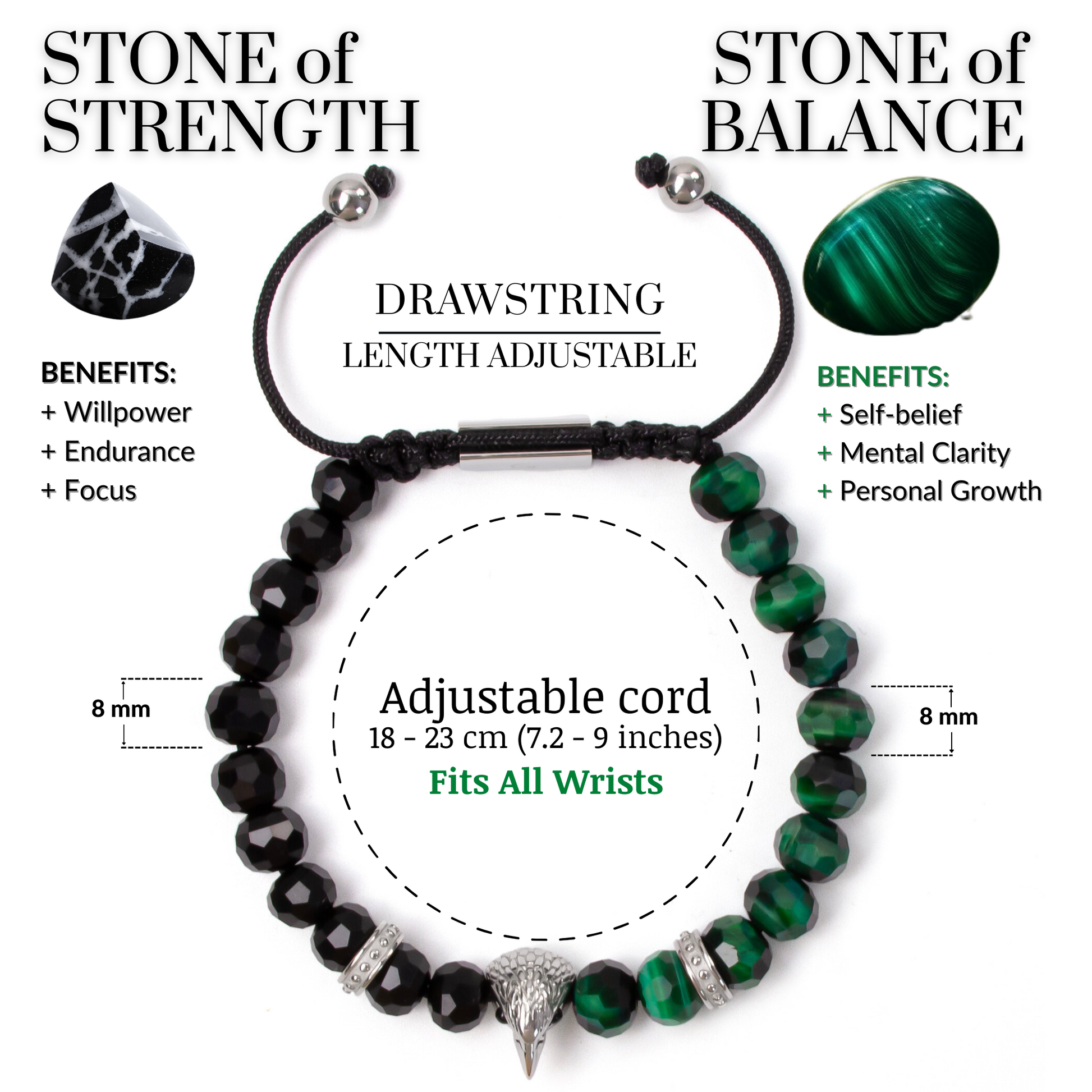 BRACCIALE AMERICAN EAGLE DA UOMO – Ispirato al maestoso potere dell'aquila americana, questo braccialetto simboleggia forza, libertà e coraggio. Realizzato a mano con pietre semipreziose naturali, presenta una suggestiva testa d'aquila al centro, un promemoria per superare le sfide e rimanere fedeli alla propria visione. Progettato per l'uomo moderno in cerca di equilibrio e scopo, questo braccialetto è più di un semplice accessorio: è un simbolo di potere interiore e sicurezza.