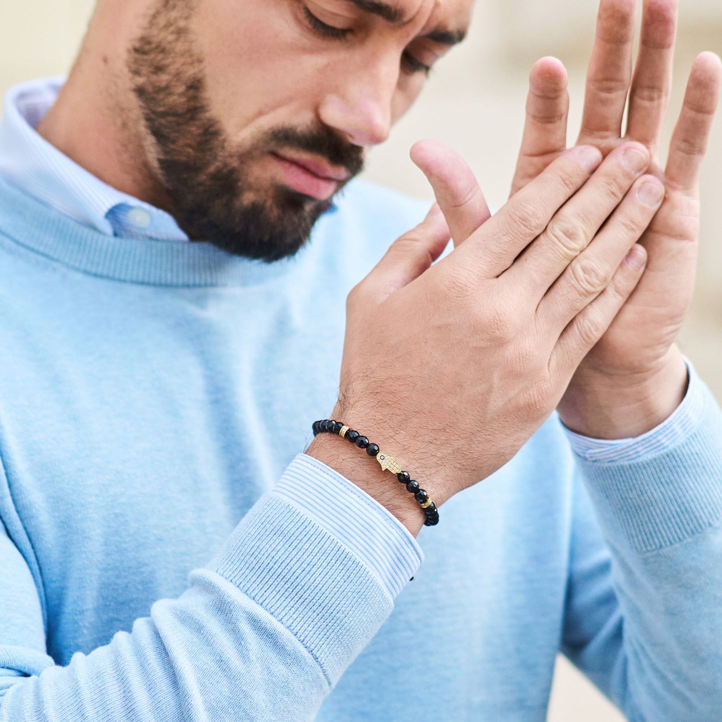 Bracciale da uomo in ONICE NERO con mano HAMSA dorata